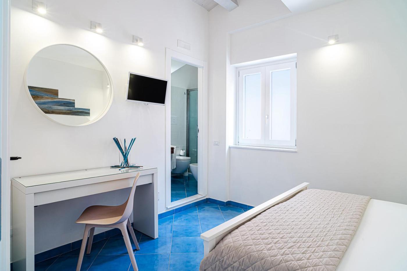 Camera Matrimoniale con Vista Mare. Camera matrimoniale dotata di bagno privato con doccia, asciugacapelli, bidet edi cortesia. La sistemazione include aria condizionata, TV a schermo piatto, ingresso indipendente, pareti insonorizzate, armadio e vista sul mare. Presenta 1 letto.